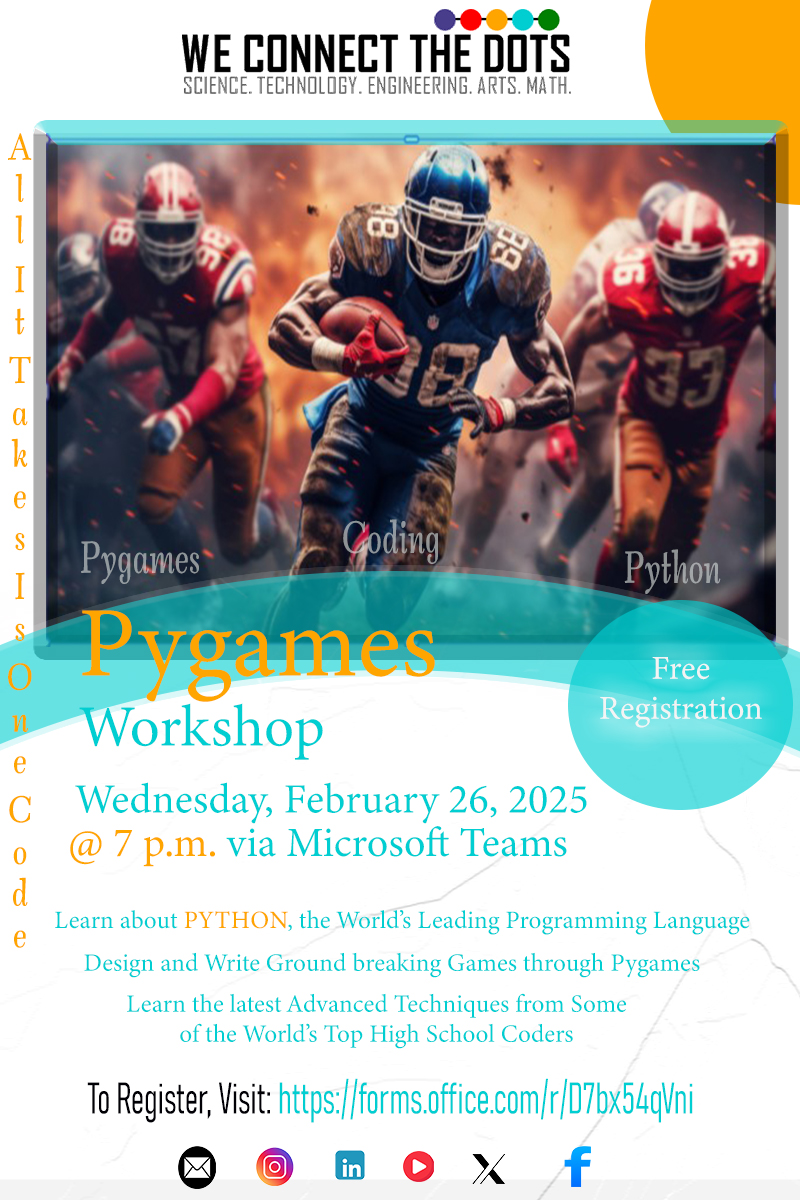 If you have an interest in creating and designing games, I highly recommend checking out this exciting workshop. Learn how to code and use Python, the world’s leading programming language. Set aside you’re evening for an amazing time in gaming. Boost your skills with some amazing high school coders who are changing the game. I am impressed with the remarkable changes they are making in technology. Acting as student ambassadors, giving back to the community they serve. All before stepping into college. Boss moves!